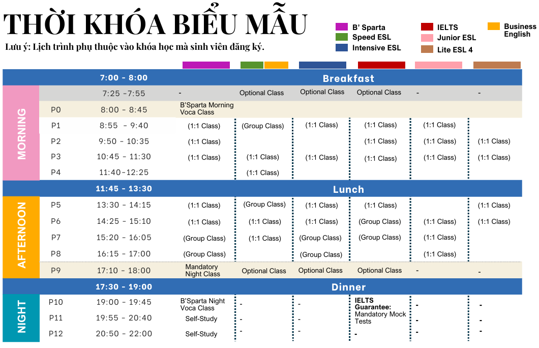 | B'SPARTA | 5 | 2 | 5 (Bắt buộc) | 12 | Dành cho mọi trình độ, muốn tập trung học chuyên sâu với lịch trình dày đặc. |
