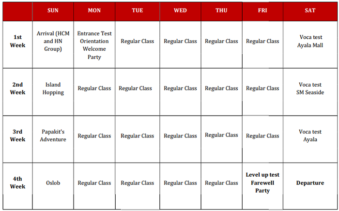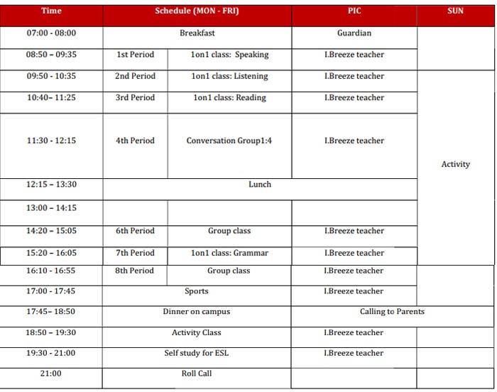 Là ngôi trường có cơ sở vật chất hiện đại, tiện nghi cùng hệ thống quản lý chặt chẽ, môi trường giao tiếp quốc tế là yếu tố tích cực giúp học viên phát triển nhanh nhất kỹ năng giao tiếp trong thời gian ngắn. Vậy chúng ta hãy cùng xem lịch trình học trong trại hè của các con tại ngôi trường này như thế nào: