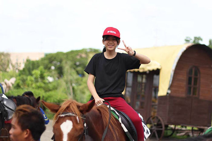Như Ngọc trong hoạt động thể thao cưỡi ngựa tại trại hè tiếng Anh