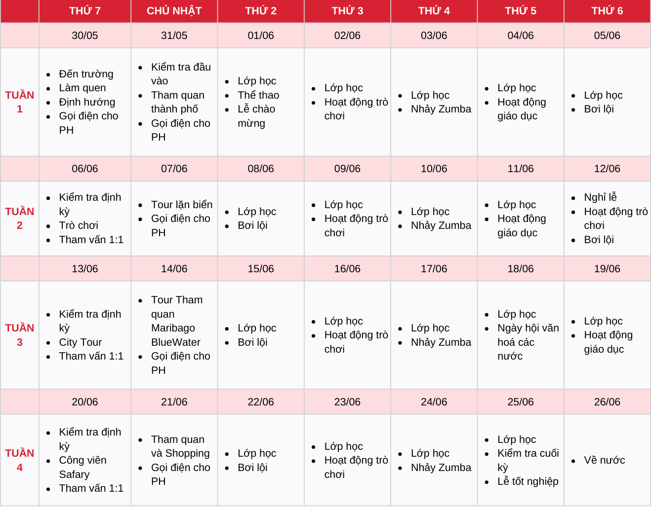 Tại đây, học viên được tham gia các lớp tiếng Anh ứng dụng, hoạt động ngoại khóa đa dạng và những thử thách giúp hình thành thói quen tự lập, tư duy linh hoạt và khả năng làm việc nhóm. Trại hè là lựa chọn phù hợp cho phụ huynh mong muốn con vừa học hiệu quả, vừa trải nghiệm mùa hè ý nghĩa trong môi trường quốc tế chuyên về tiếng Anh giao tiếp.
