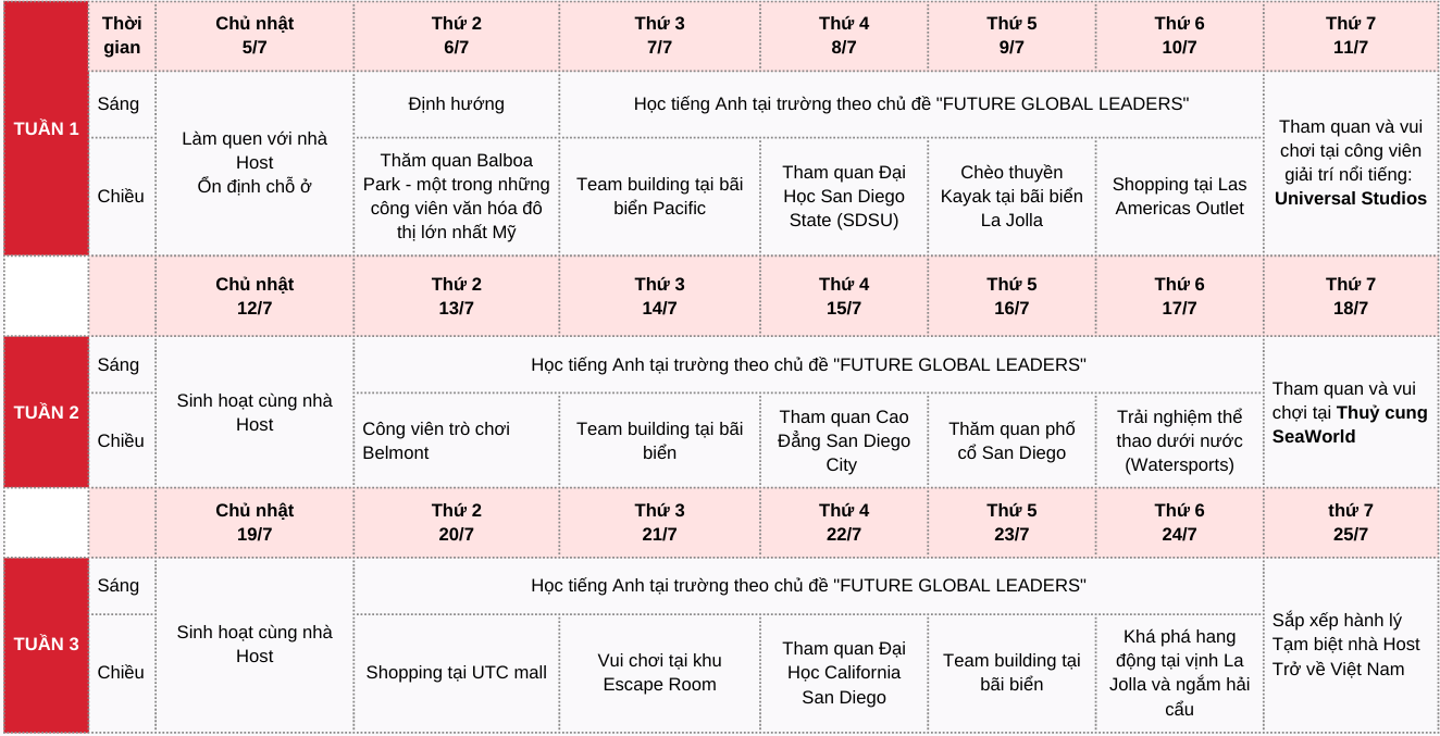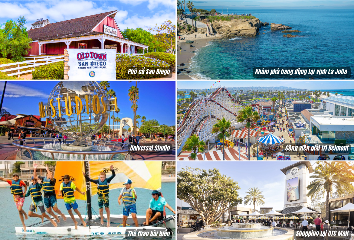 Học viên được tham quan các danh lam thắng cảnh nổi tiếng như phố cổ San Diego, các bãi biển tuyệt đẹp Mission, Colorado, Pacific...và có những trải nghiệm thú vị, đậm chất Mỹ tại Universal, Hollywood hay các trận đấu bóng chày...