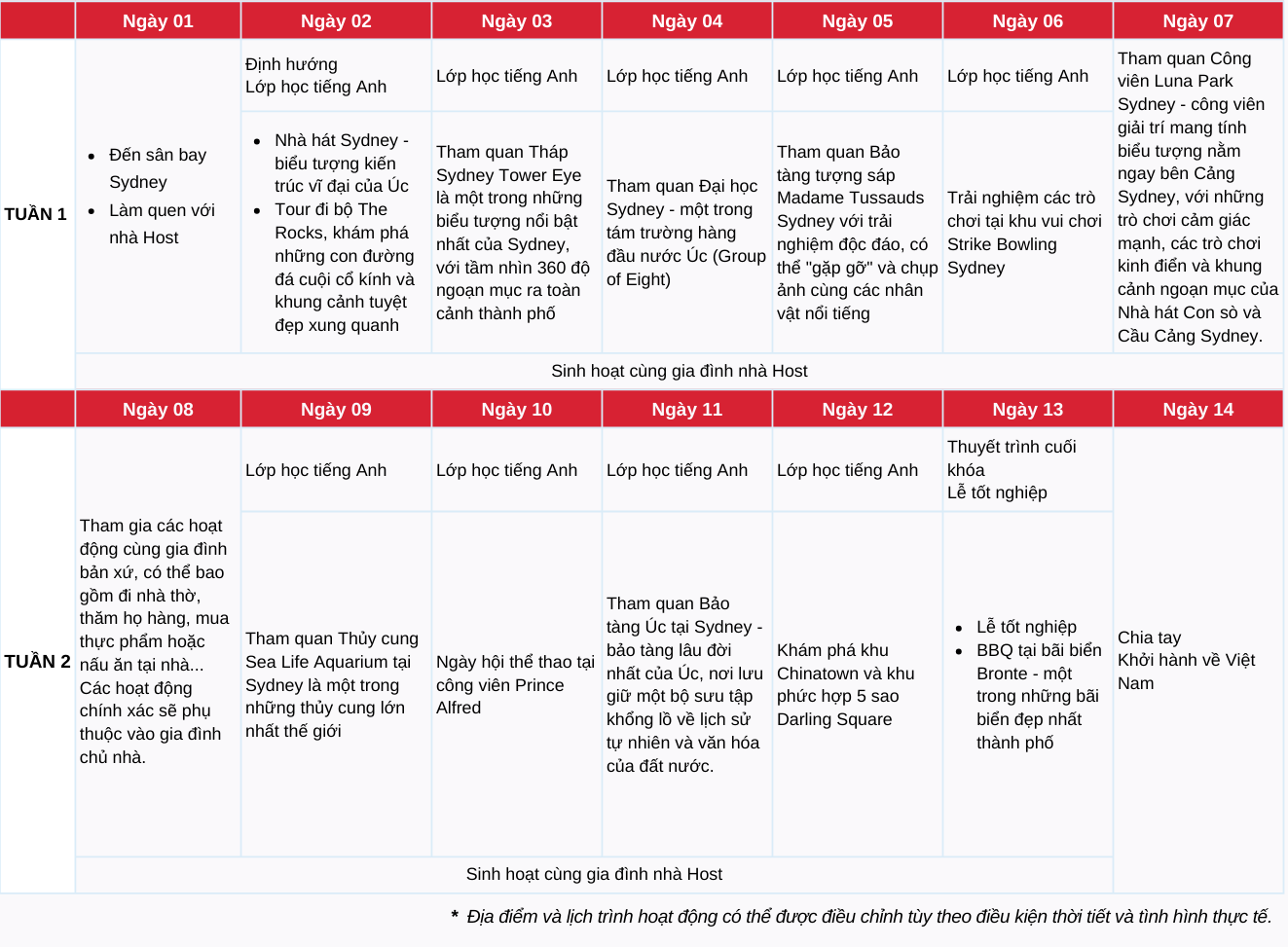 Ở cùng gia đình bản xứ (homestay) thân thiện, học viên sẽ được trải nghiệm cuộc sống của người Úc một cách chân thực và gần gũi. Đây là cơ hội tuyệt vời để học viên rèn luyện khả năng giao tiếp tiếng Anh, đồng thời hiểu thêm về văn hóa, ẩm thực và lối sống đặc trưng của đất nước Australia.