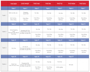 - Các bữa ăn sáng, trưa, tối theo lịch của trường.