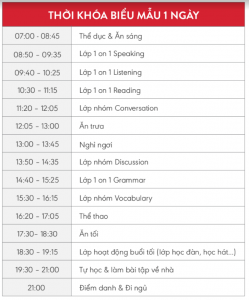 - Cấu trúc lớp học: lớp 1:1 (3-4 tiết học, mỗi tiết 50’, 1 giáo viên kèm 1 học sinh), các lớp 1:4 (1 giáo viên – 4 học sinh), lớp 1:8 (1 giáo viên- 8 học sinh), giờ tự học, làm bài tập về nhà. Mô hình học chú trọng vào sự phát triển từng kỹ năng của mỗi học sinh giúp các con hoàn toàn tự tin về tiếng Anh sau khi kết thúc trại hè.