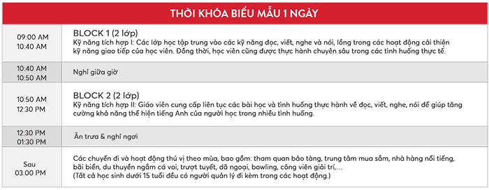 Lưu ý: Hoạt động ngoại khoá và dã ngoại có thể thay đổi tuỳ thuộc vào điều kiện thời tiết.