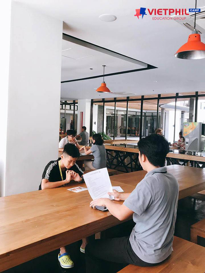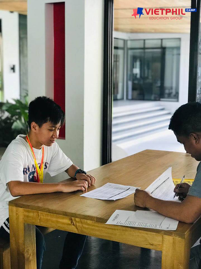 Cũng như các bạn VietPhil Camp tại những điểm trường khác, ngày đầu các con được tham quan trường, nghe phổ biến về quy định và đặc biệt làm bài test trình độ để sắp xếp phương pháp, giáo trình và giáo viên phù hợp với mình nhất.